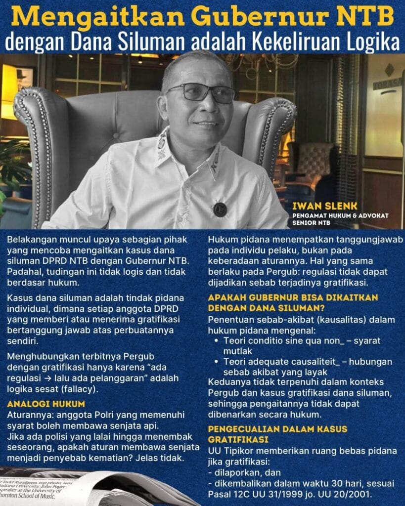 Dana Siluman—uang rakyat yang dialokasikan tanpa mekanisme yang jelas—melukai rasa keadilan. Namun, pengamat hukum Iwan Slenk, Senior Advocate & Lecturer, muncul dengan analisis tajam. Menurutnya, “Mengaitkan Gubernur NTB dengan Dana Siluman adalah Kekeliruan Logika” ().