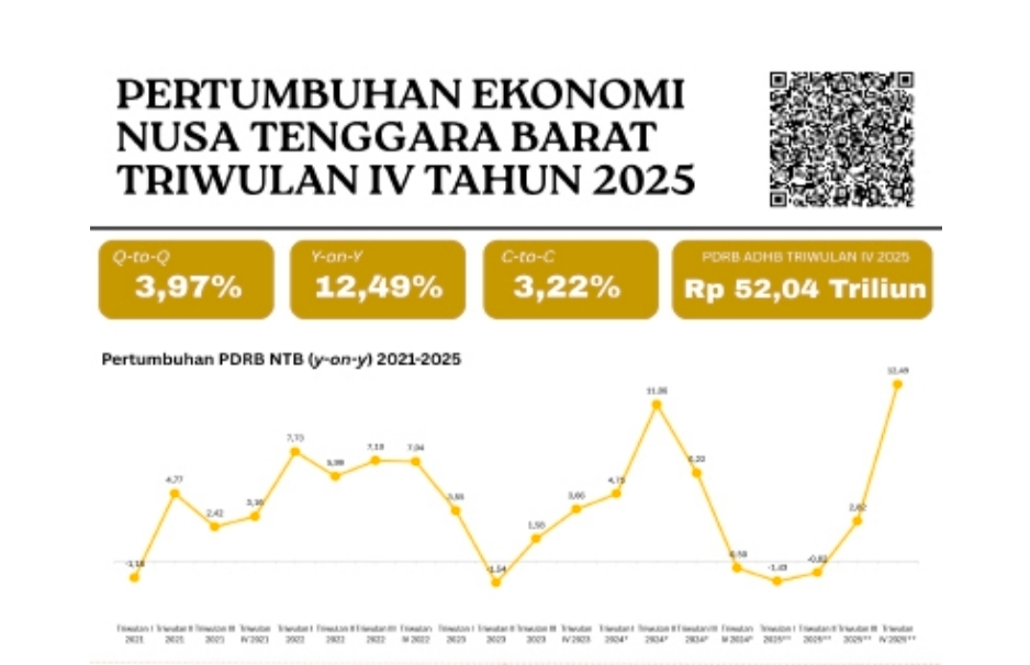 MATARAM — Roda ekonomi Nusa Tenggara Barat (NTB) menutup tahun 2025 dengan raungan mesin yang cukup kencang. Badan Pusat Statistik (BPS) baru saja merilis data pertumbuhan ekonomi Triwulan IV-2025 yang mencatatkan lonjakan fantastis sebesar 12,49 persen secara tahunan (year-on-year). Jika dilihat secara kumulatif selama setahun penuh, ekonomi NTB tumbuh stabil di angka 3,22 persen.