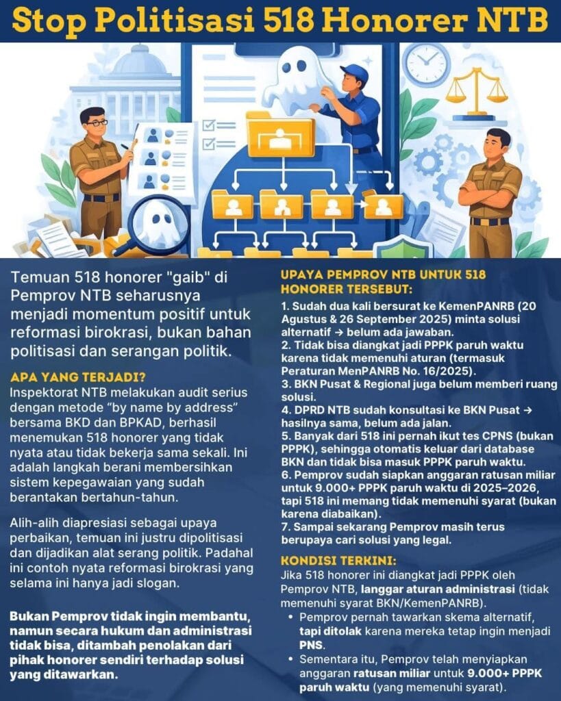 “Jangan Politisasi 518 Honorer.” Pesan ini muncul dari kanal media sosial Facebook NTB on The Right Track, sebuah upaya counter-narrative yang cerdas. Inti pesannya: Pemerintah sedang reformasi, jangan diserang.