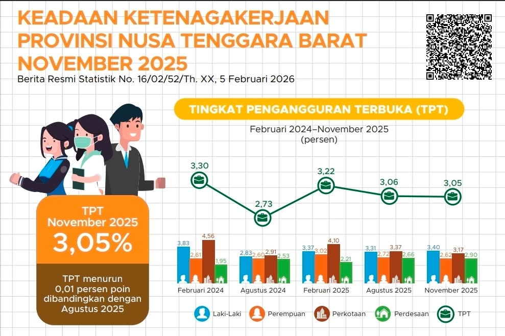 MATARAM — Kabar segar kembali berembus dari lantai statistik Nusa Tenggara Barat. Berdasarkan rilis terbaru BPS, kondisi ketenagakerjaan di NTB per November 2025 menunjukkan performa yang cukup tangguh. Tingkat Pengangguran Terbuka (TPT) berhasil ditekan ke angka 3,05 persen, sebuah capaian yang menempatkan NTB di jalur stabilisasi pasca-pandemi dan dinamika ekonomi global.