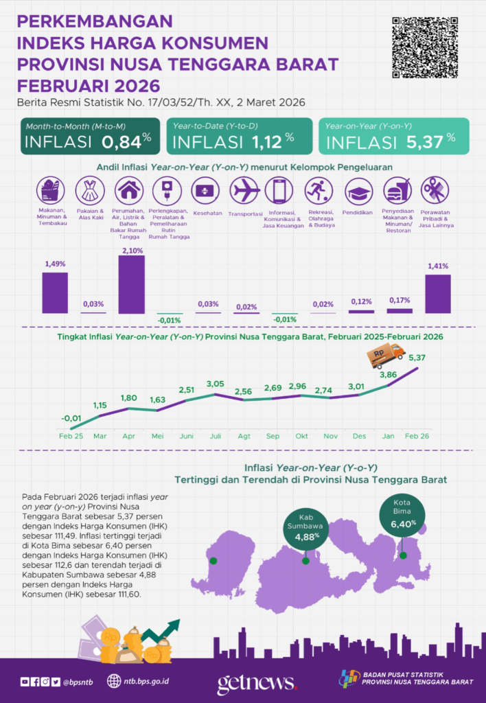 MATARAM — Jika ekonomi Nusa Tenggara Barat (NTB) pada Februari 2026 adalah sebuah simfoni, maka suaranya sedang meninggi ke nada yang cukup mendebarkan. Berdasarkan Berita Resmi Statistik (BRS) terbaru, inflasi tahunan (year-on-year) NTB melonjak ke angka 5,37 persen. Angka ini jauh lebih “pedas” dibandingkan proyeksi moderat sebelumnya, menempatkan Kota Bima sebagai juara inflasi regional dengan rekor 6,40 persen.